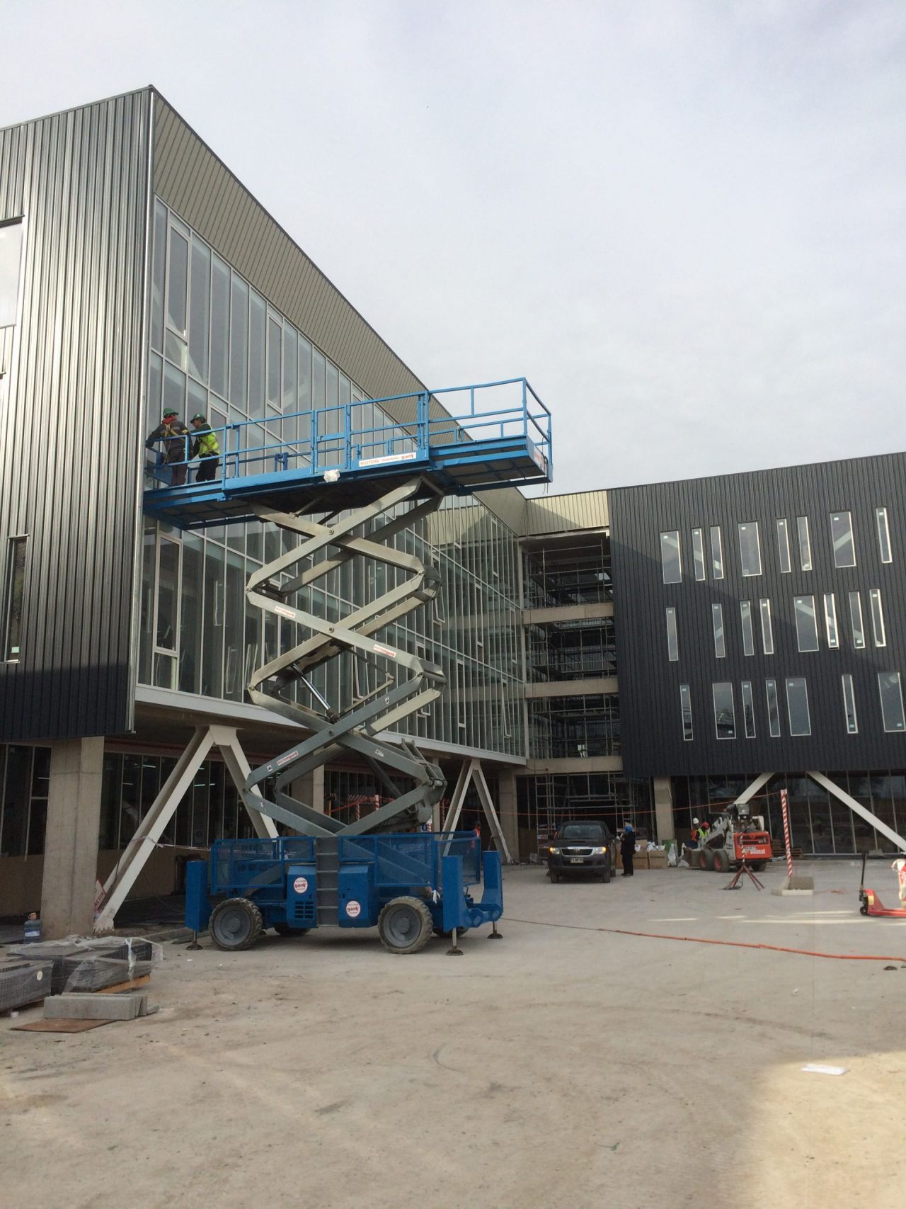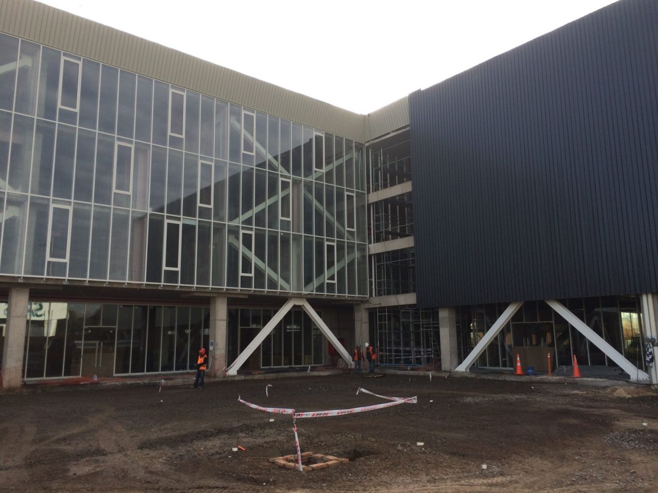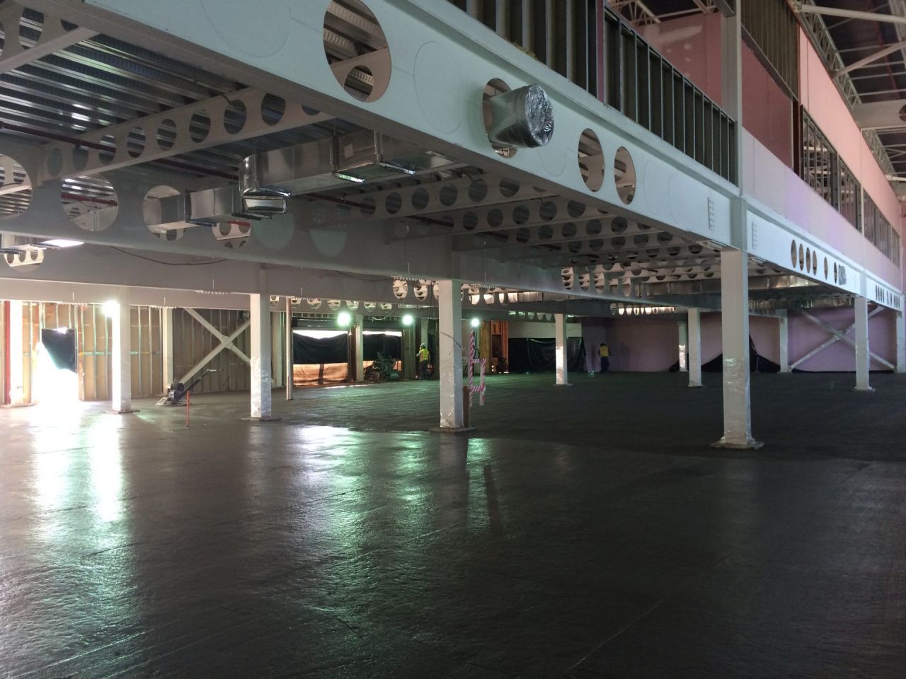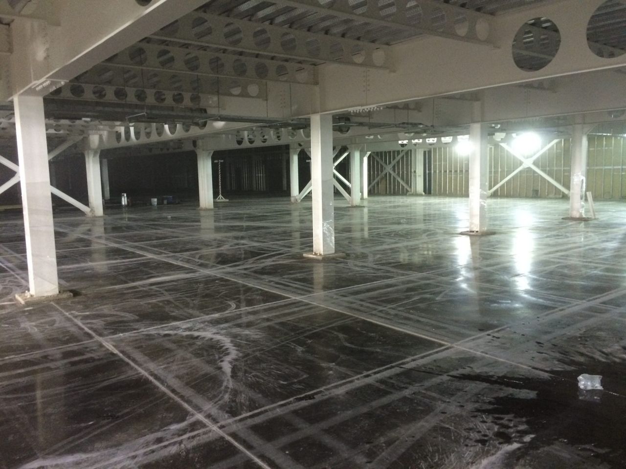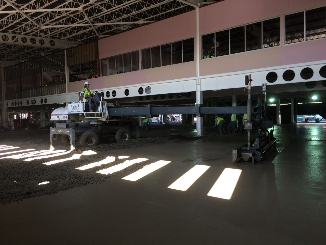 Piso interior con sistema interlocking para traspaso de cargas y patio de camiones.