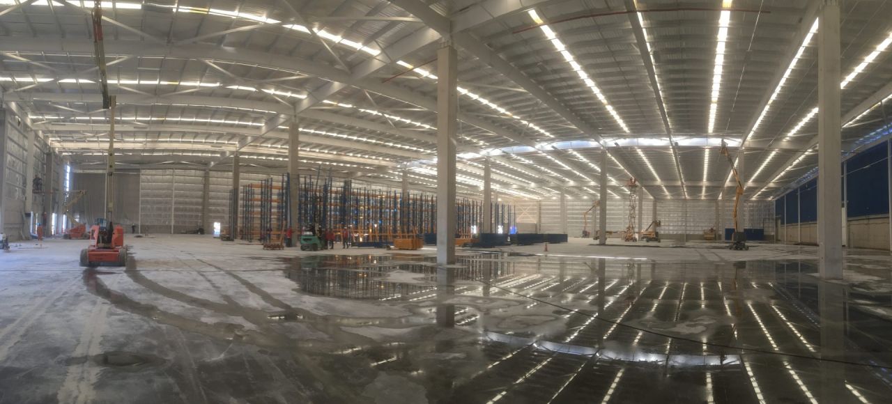 Centro de distribución para nuestro cliente Blue Express construido de la mano de Gestión Arquitectonica, inspección técnica Videla y asociados y constructora Gresol, ubicado en la comuna de Pudahuel. cubre una superfice de 9.074,27 m2 de Retracción Compensada, pisos para transito definido con altos requerimientos de planeidad para la distribución y almacenaje de productos en grandes alturas para la industria logistica.