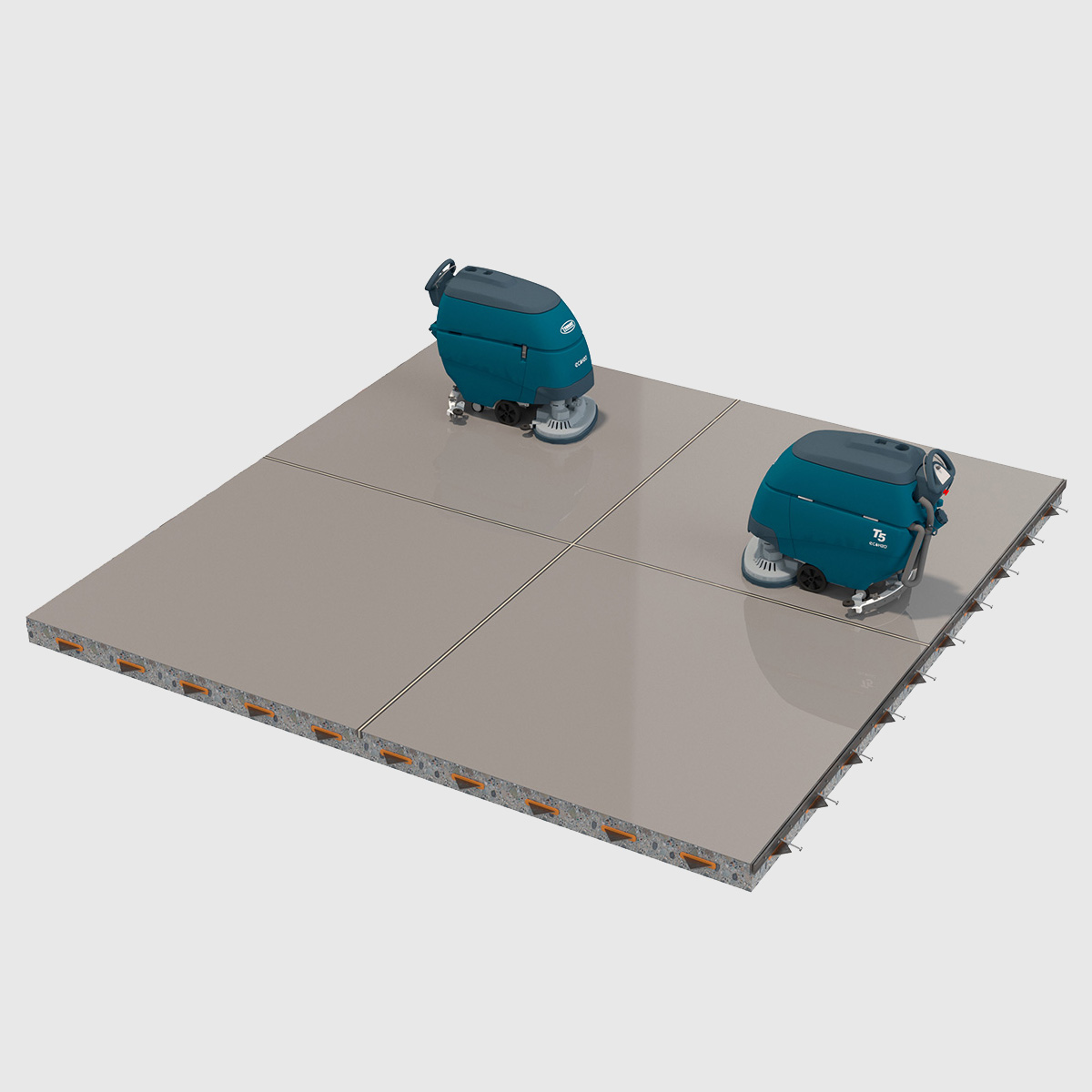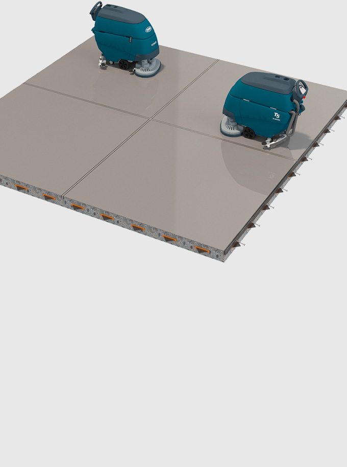 Combinamos el uso de agua, cepillos y pads abrasivos para eliminar la suciedad y las sales de los pisos recién construidos que deben ser entregados en tiempos muy acotados. Con equipos industriales se avanza hasta 3.000 m2/día.